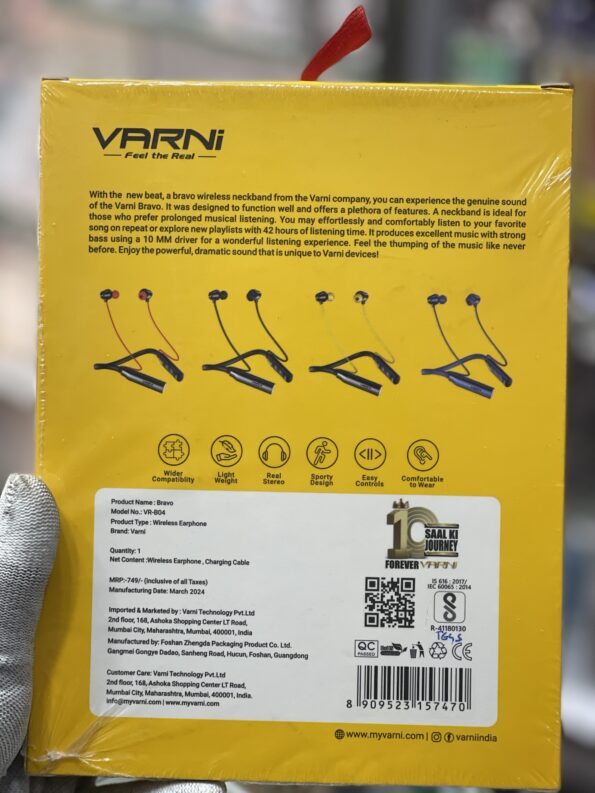 With the new beat, a bravo wireless neckband from the Varni company, you can experience the genuine so of the Varni Bravo. It was designed to function well and offers a plethora of features. A neckband is ideal those who prefer prolonged musical listening. You may effortlessly and comfortably listen to your favo song on repeat or explore new playlists with 42 hours of listening time. It produces excellent music with stro bass using a 10 MM driver for a wonderful listening experience. Feel the thumping of the music like nev before. Enjoy the powerful, dramatic sound that is unique to Varni devices!